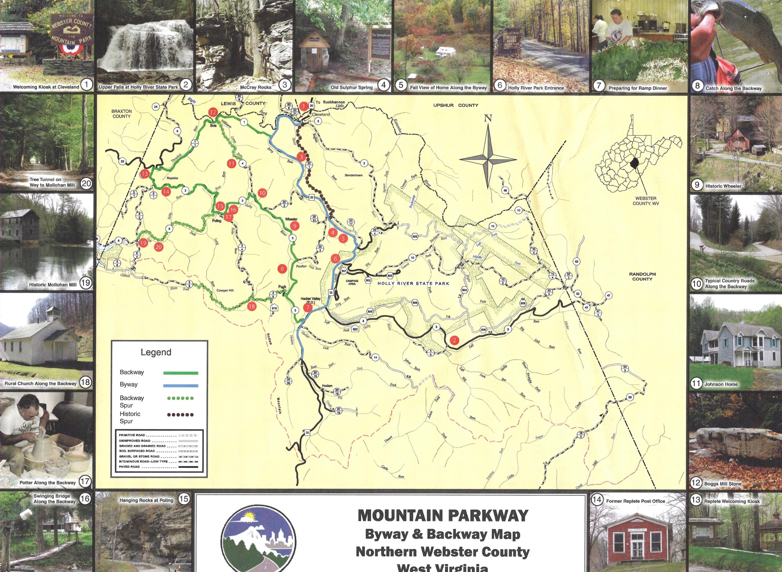 The Mountain Parkway Byway and Backway winds through the valleys and over the hills of Northern Webster County. Designated by the WV Department of Highways in 1998, the Backway covers some 45 miles and the Byway spans over 10 miles with informative signage at several locations. The area offers a wide range of interesting and unique historic, cultural, and scenic sites for visitors to enjoy. Also, a variety of crafters along the route offer unique products including pottery, baskets, wood crafts and handmade jewelry. Throughout the year there are activities including the Holly River Festival, Irish Road Bowling, Jerry Run Summer Theater, ramp dinners and more.