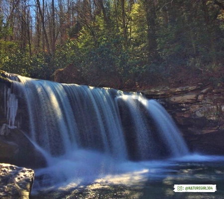 These Holly River State Park waterfalls are not to miss! When entering into Holly River State Park on Left Fork Holly River Rd (CR 3), do not bear left toward the park headquarters, but go straight, passing the park maintenance facility on your right and drive 4.8 miles to a parking area. Walk down the ramps and steps into the creek in front of the falls.