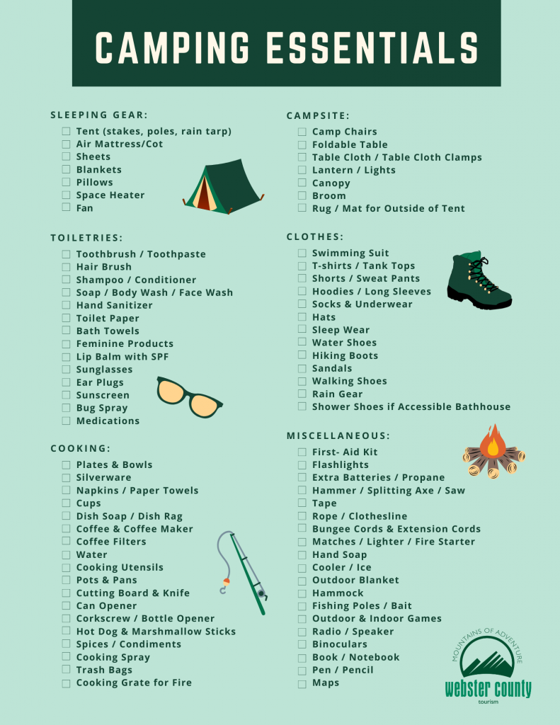 Save and print off this Camping Essentials Checklist for your next camping trip to Webster County!