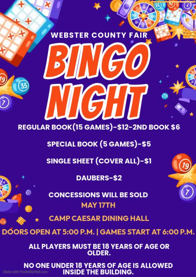 Webster County Fair Bingo Night is Saturday May 17th, 2025 at Camp Caesar’s Dining hall. Doors will open at 5:00PM and games start at 6!