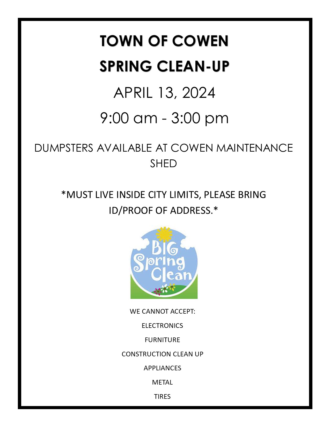 The Town of Cowen will hold their annual Make it Shine town wide clean up Saturday April 13, 2024!