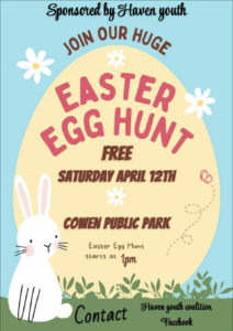 The Haven Youth Coalition is hosting an Easter Egg Hunt ***rescheduled*** for Wednesday April 16th, 2025 at 5:30 PM at the Cowen Public Park!