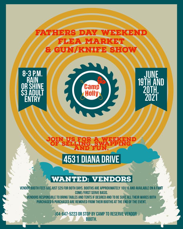 « All Events This event has passed. Father’s Day Weekend – Flea Market & Gun/Knife Show June 19, 2021 @ 8:00 am - June 20, 2021 @ 3:00 pm $3.00 « John King – Live Music at Woodchopping Festival Jerry Run Summer Theater: Full Cirkle » Rain or shine, join us for a weekend of selling, swapping and fun! Add to calendar Google Calendar iCalendar Outlook 365 Outlook Live Details Start: June 19, 2021 @ 8:00 am End: June 20, 2021 @ 3:00 pm Cost: $3.00 Website: https://www.facebook.com/camphollywv/photos/a.115109210658866/130480155788438/ Venue Camp Holly 4531 Diana Drive Diana, WV 26217 United States + Google Map Phone 3048475223