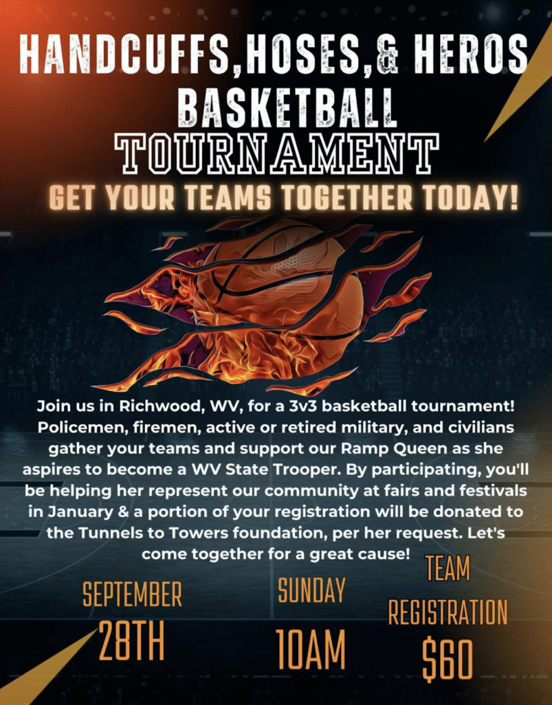 Join Ramp Queen, Kinley, at the Richwood Community Center for the Handcuffs, Hoses & Heroes Basketball Tournament on Sunday September 28th, 2025 at 10:00 AM!