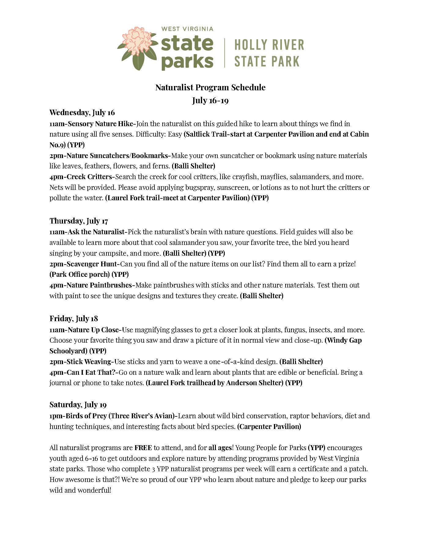 « All Events This event has passed. Naturalist Activities July 16 @ 8:00 am - July 19 @ 5:00 pm Free « Summer Pool Party Mountain Fury Live in Concert » Join Naturalist Haley at Holly River State Park for family fun activities this week! Add to calendar Google Calendar iCalendar Outlook 365 Outlook Live Details Start: July 16 @ 8:00 am End: July 19 @ 5:00 pm Cost: Free Event Categories: Community Events, Outdoor Activities Organizer Holly River State Park Phone 304-493-6353 Email hollyriversp@wv.gov View Organizer Website Venue Holly River State Park 680 State Park Rd. Hacker Valley, WV 26222 United States + Google Map