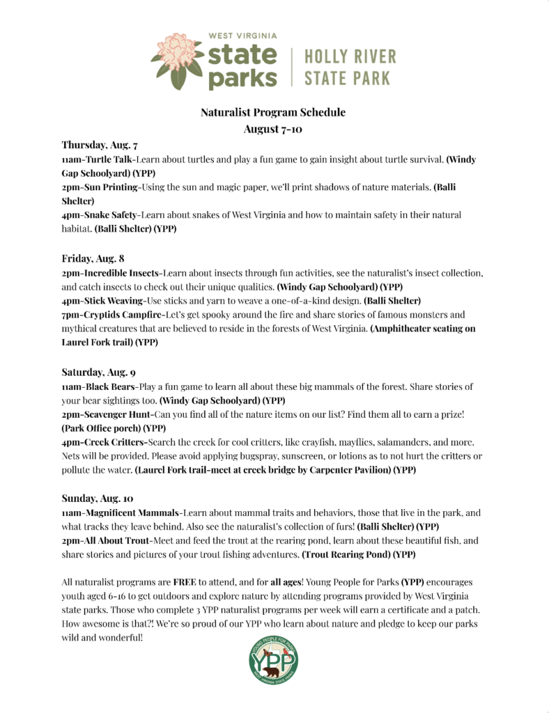 « All Events This event has passed. Naturalist Events August 7 @ 8:00 am - August 10 @ 3:00 pm Free « Gospel Sing Buck & Company Live at Jerry Run Summer Theater » Join Naturalist Haley for some outdoor, family fun events at Holly River State Park this weekend! Add to calendar Google Calendar iCalendar Outlook 365 Outlook Live Details Start: August 7 @ 8:00 am End: August 10 @ 3:00 pm Cost: Free Organizer Holly River State Park Phone 304-493-6353 Email hollyriversp@wv.gov View Organizer Website Venue Holly River State Park 680 State Park Rd. Hacker Valley, WV 26222 United States + Google Map