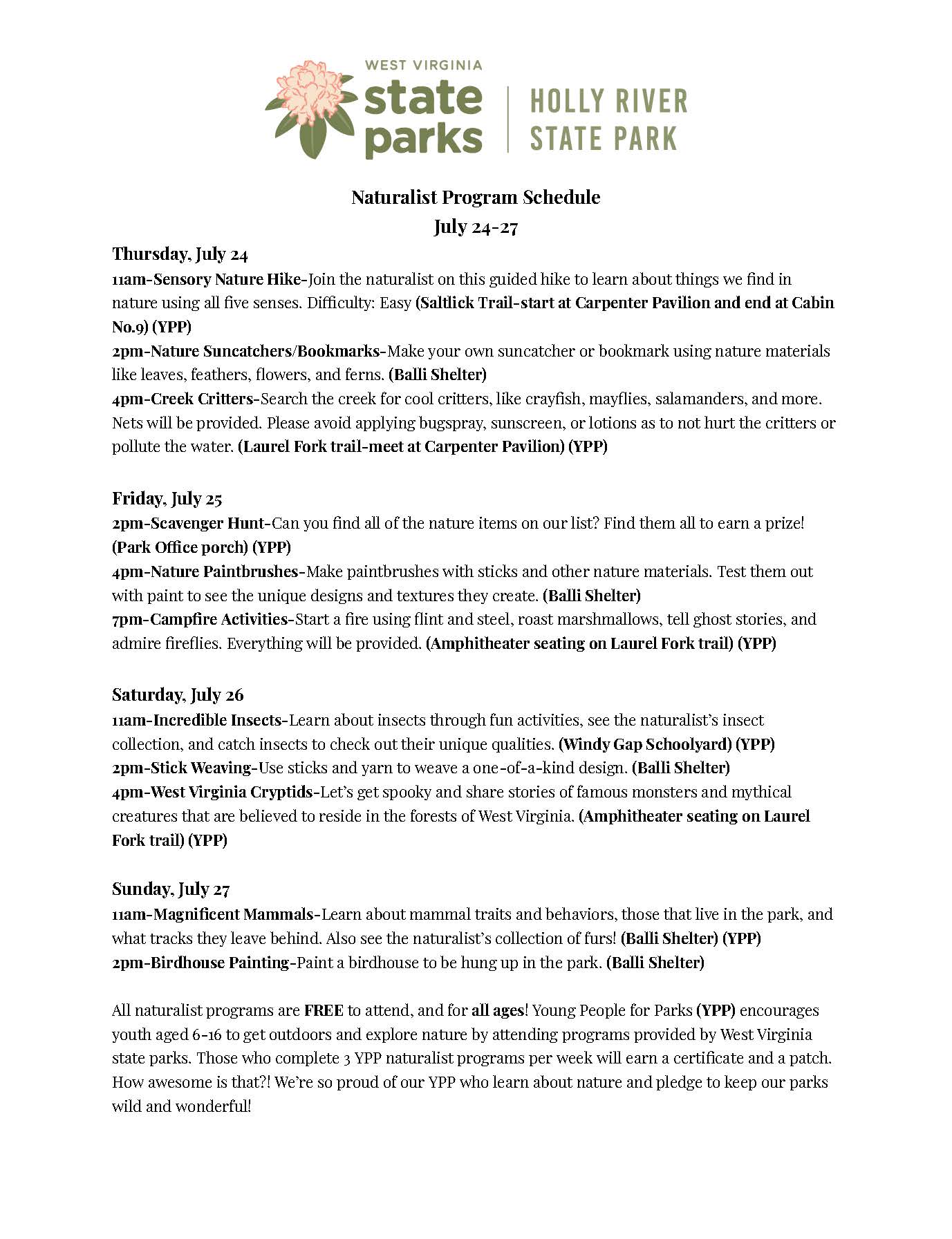 « All Events This event has passed. Naturalist Schedule July 24 @ 11:00 am - July 27 @ 3:00 pm Free « Movie in the Park: Pirates of the Caribbean Summer Pool Party » Join naturalist haley for family fun activities at Holly River State Park! Add to calendar Google Calendar iCalendar Outlook 365 Outlook Live Details Start: July 24 @ 11:00 am End: July 27 @ 3:00 pm Cost: Free Event Categories: Community Events, Outdoor Activities Organizer Holly River State Park Phone 304-493-6353 Email hollyriversp@wv.gov View Organizer Website Venue Holly River State Park 680 State Park Rd. Hacker Valley, WV 26222 United States + Google Map