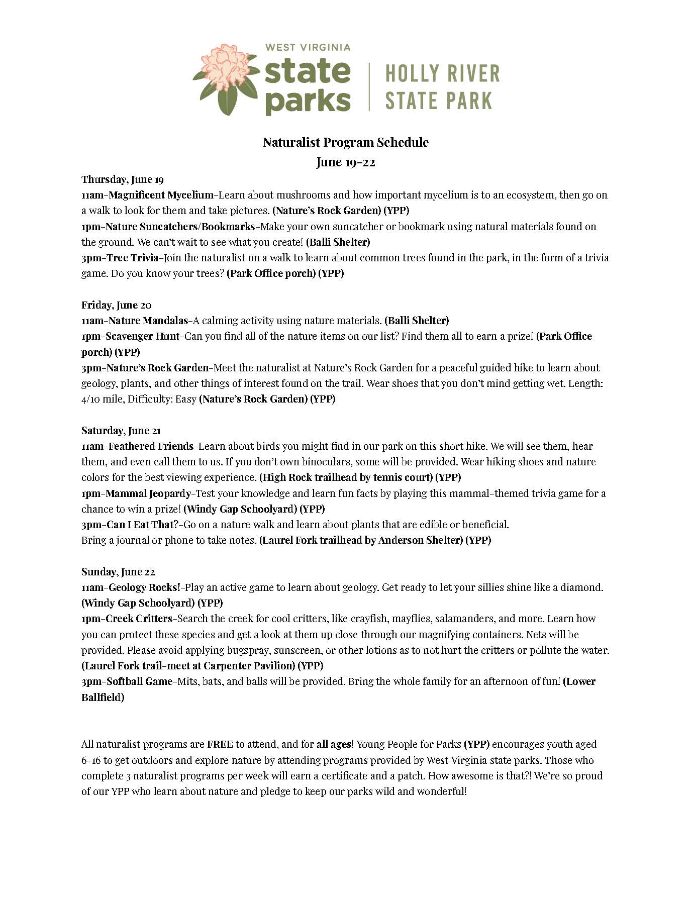 « All Events This event has passed. Naturalist Schedule June 19 @ 8:00 am - June 22 @ 5:00 pm Free « The Wild Shoats Live at Jerry Run Summer Theater Cowen Community Yard Sale » Join Naturalist Haley this week for so many fun activities at Holly River State Park! Add to calendar Google Calendar iCalendar Outlook 365 Outlook Live Details Start: June 19 @ 8:00 am End: June 22 @ 5:00 pm Cost: Free Organizer Holly River State Park Phone 304-493-6353 Email hollyriversp@wv.gov View Organizer Website Venue Holly River State Park 680 State Park Rd. Hacker Valley, WV 26222 United States + Google Map